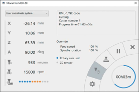 集成于設備單元前端的控制版面幾乎可以控制所有操作,用戶無需往返于電腦與設備之間。VPanel界面可與MDX-50無縫對接,方便用戶調整主軸轉速和速率。